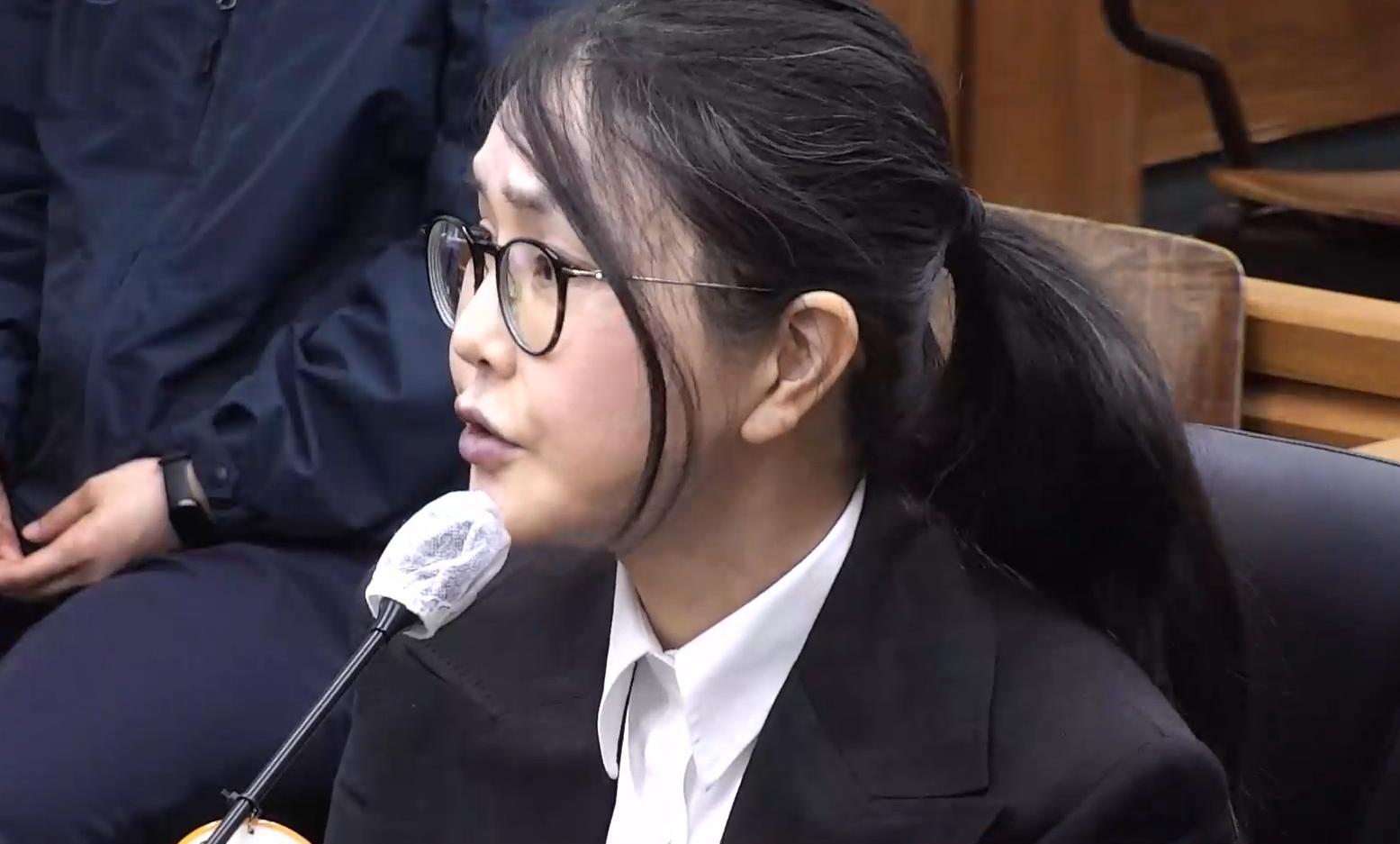 마스크를 벗고 증인 선서. 평소보다 힘이 빠지고 거칠어진 목소리로 선서 진행. "피고인 윤석열의 배우자가 맞냐"는 질문에 "맞다"라고 답변.