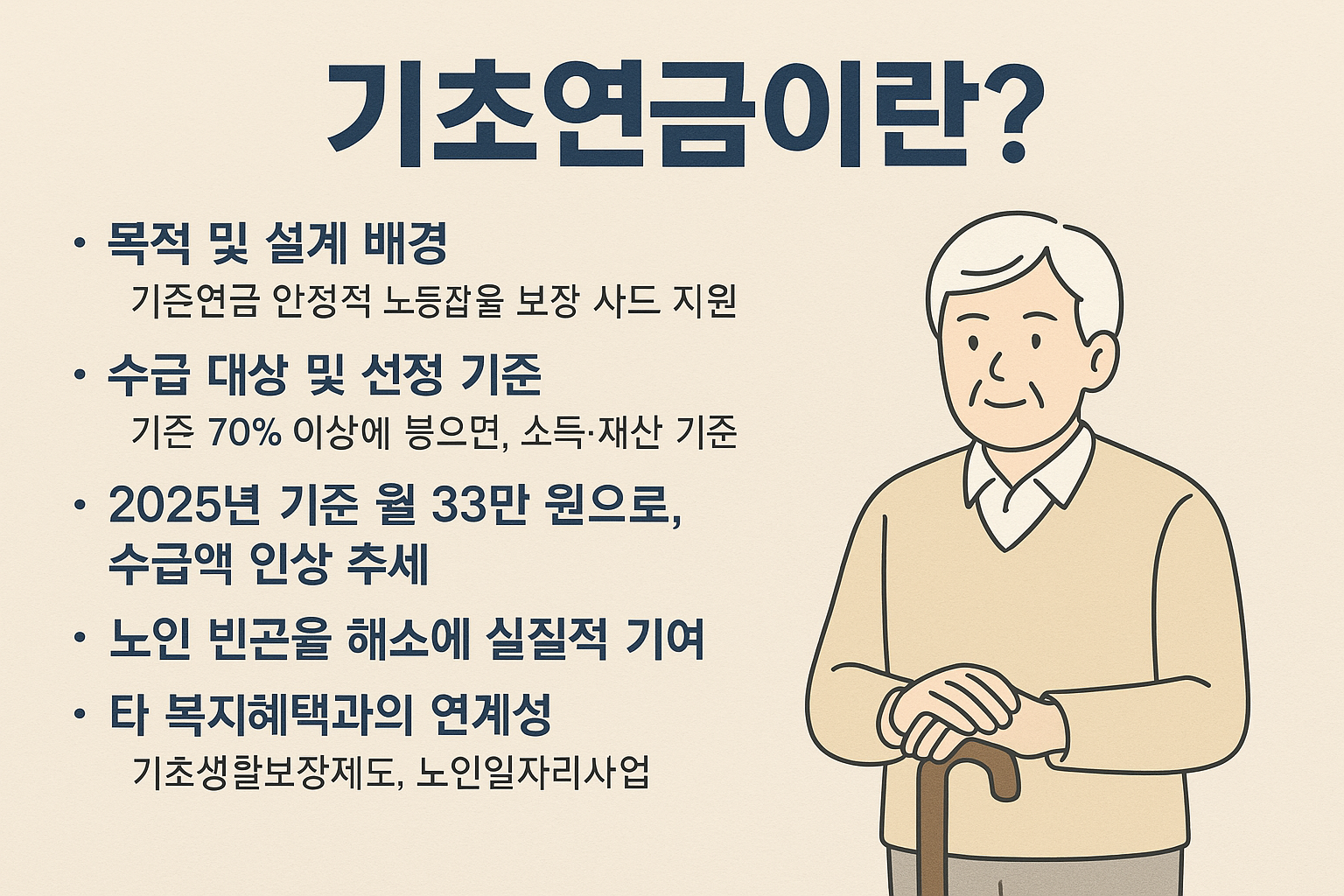 기초연금은 만 65세 이상 어르신 중 소득과 재산이 적은 분들에게 매월 지급하는 연금입니다. 2025년에는 지급 대상과 금액이 확대되었습니다.