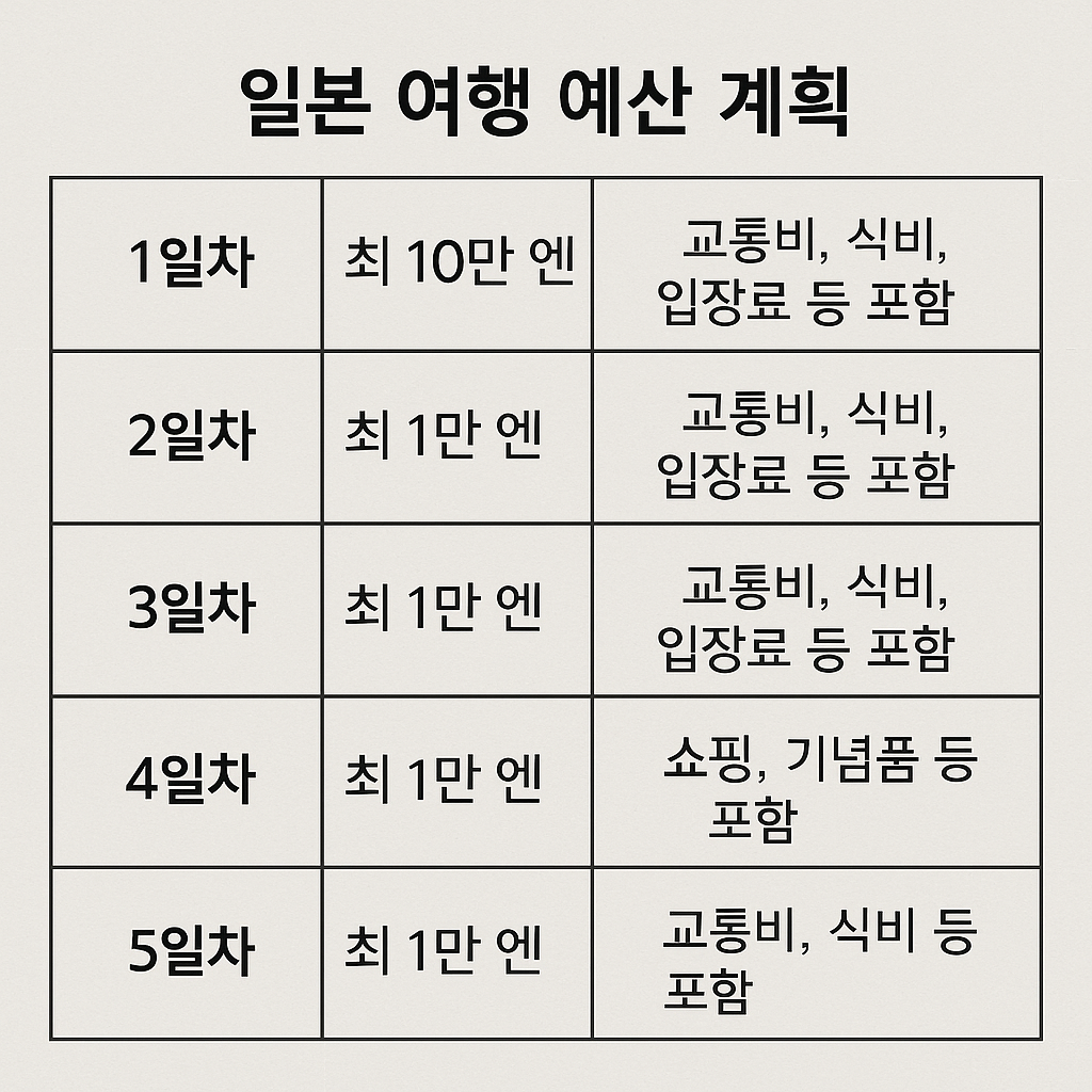 ▲ 일본 5일 여행 일별 예산 계획 예시